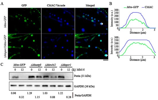 Mitophagy occurs in the ΔMopsr1 mutant in M. oryzae. (A) The mitochondria of the ΔMopsr1 strain were delivered into vacuoles upon nitrogen starvation. Similar to the Mito-GFP strain, the Mito-GFP-marked mitochondria were delivered into vacuoles in the ΔMopsr1 mutant. Scale bar = 5 μm. (B) Linescan graph analysis of the region indicated by arrow in (A). (C) Immunoblotting detection of the mitochondria outer membrane protein Porin. The indicated strains were cultured in liquid CM for 2 days, then shifted to BM-G (1.5% glycerol) for 30 h, followed by starvation in MM-N for 12 h. Mycelia were harvested to perform immunoblot assays with anti-Porin antibody. The values represent the percentage of Porin/GAPDH in the indicated strain analyzed by Image J. Similar results were obtained from two biological repeats.
