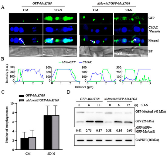 In yeast, disruption of WHI2 has no significant effects on autophagy [13,17]. To determine whether MoWhi2 is required for autophagy in M. oryzae, deletion mutants of MoWHI2 were generated in the GFP-MoATG8 strain, in which GFP-MoAtg8 is a commonly used marker of autophagy [25]. Under the autophagy-inductive condition, the colocalization of GFP-MoAtg8 with vacuoles was observed. As shown in the Figure 3A, the GFP fluorescence overlapped the CMAC-stained vacuoles in both GFP-MoATG8 and ΔMowhi2/GFP-MoATG8 strains (Figure 3A,B), suggesting that autophagy could be induced when MoWHI2 was disrupted. Furthermore, the number of autophagosomes increased in the GFP-MoATG8 and ΔMowhi2/GFP-MoATG8 strains, but there was no significant difference between GFP-MoATG8 and ΔMowhi2/GFP-MoATG8 in the SD-N (nitrogen starvation condition) medium (Figure 3C). In addition, the degradation of GFP-MoAtg8 fusion protein was detected by immunoblotting. The results demonstrated that the autophagy in mycelia of the ΔMowhi2/GFP-MoATG8 strain was comparable to that of the GFP-MoATG8 stain (Figure 3D). These results suggest that MoWhi2 is not required for autophagy in response to nitrogen starvation.