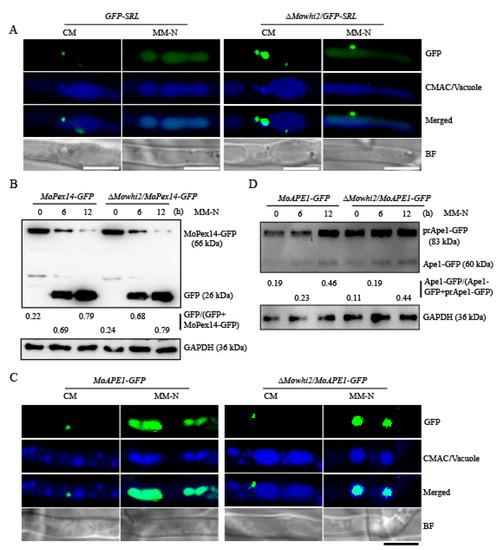 MoWhi2 is not necessary for pexophagy and the activation of the cytoplasm-to-vacuole targeting pathway in M. oryzae. (A) MoWhi2 is not necessary for pexophagy. Upon nitrogen starvation, the green fluorescence of the fusion protein GFP-SRL was overlapped with the CMAC-stained vacuoles in the ΔMowhi2/GFP-SRL as the GFP-SRL strain. (B) Vacuolar degradation of peroxisomes was detected by immunoblotting assay. The wild-type and ΔMowhi2 strains expressing MoPEX14-GFP were cultured in CM for 2 days, then transferred to MM-N medium to induce pexophagy. The degradation dynamics of MoPex14-GFP were similar in the MoPEX14-GFP and ΔMowhi2/MoPEX14-GFP strains. (C,D) MoWhi2 is not necessary for activation of the cytoplasm-to-vacuole targeting pathway in M. oryzae. Fluorescent imaging (C) and immunoblot analysis (D) showed the maturation of MoApe1, a marker protein of the CVT pathway, in the MoAPE1-GFP and ΔMowhi2/MoAPE1-GFP strains. Similar results were obtained from three biological replicates. Scale bar = 5 μm.
