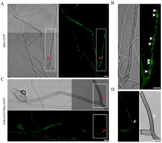 Mitophagy during conidiation in the Mito-GFP and ΔMowhi2/Mito-GFP strains. Mitophagy in foot cells was affected in the ΔMowhi2/Mito-GFP strain. Foot cells of the indicated strains were induced by culturing mycelial plugs on glass slides with a thin layer of agar medium. Pictures in (A–D) were captured at 20 hpi (hours post inoculation). Among them, panels (B,D) display magnified areas labeled by white boxes in the left panels of (A,C), respectively. The red arrows represent vacuoles and the white arrows represent mitochondria. Scale bar = 10 μm.