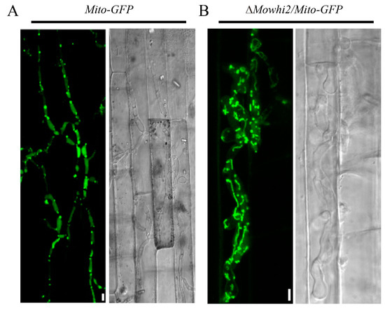 Fluorescent observation of GFP in the Mito-GFP (A) and ΔMowhi2/Mito-GFP strains (B) during the invasive growth stage. Conidial suspensions of the indicated strains were inoculated on rice sheaths from 3-week-old Co39 (Oryza sativa) seedlings. Photographs were taken by a confocal microscope at 60 hpi.