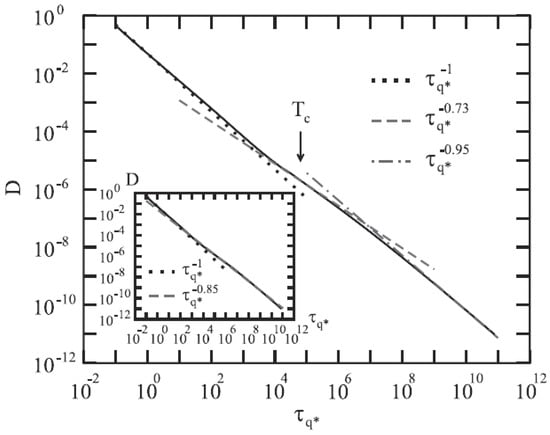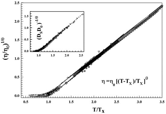 Many glass forming liquids appear to be “fragile” at high temperature whereas are “strong” at the lower temperatures. Thus, they change with T their energetic configuration implying a change in the corresponding landscape topographies—a situation that suggests, in these supercooled liquids, a possible connection between their thermodynamics and the kinetics. The onset of a sharp increase in over a relative small T range is characterized by a fragile to strong dynamic crossover (or critical) temperature (identified as the critical MCT ) []. This situation is characteristic of a very large number of glass forming liquids, and can be considered a universal process, providing further confirmation of the energy landscape model. In particular, the viscosity curves of these liquids collapse into a single curve only by assuming as the only characteristic temperature. Figure 2 illustrates this process by reporting the viscosity and diffusion data of more than 80 glass forming liquids. These data also show that below , the familiar Stokes–Einstein relation () breaks down and is replaced by a fractional form , with .