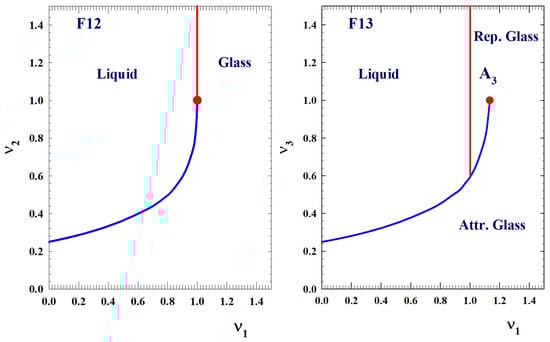 where v as the control parameter. Depending just on , MCT defines different models with different properties [,]. More precisely, for it is defined the continuous model A (), whereas for () we have the model B, characterized at the transition by an order parameter discontinuity. In that case the corresponding dynamic behavior is characterized by a two-step relaxation time typical of the glass transition.