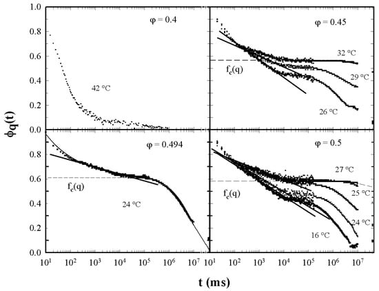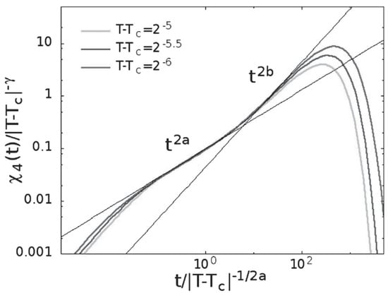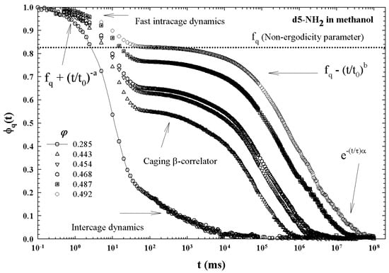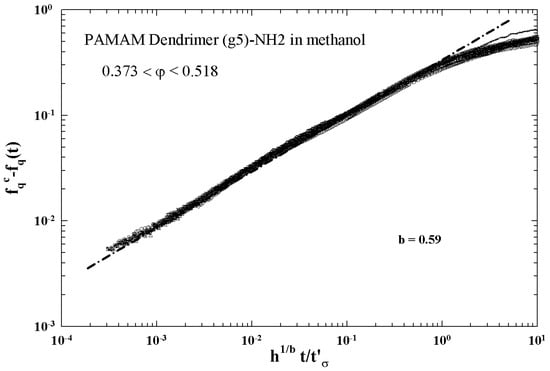 Figure 5 illustrates the different characteristic MCT time regions. The corresponding ISFs were measured by PCS experiments made in a colloidal suspension of a PAMAM d5 NH dendrimer in methanol, at different . The von Schweidler universal plot obtained from these (Figure 5) is illustrated in Figure 6 ( and ).