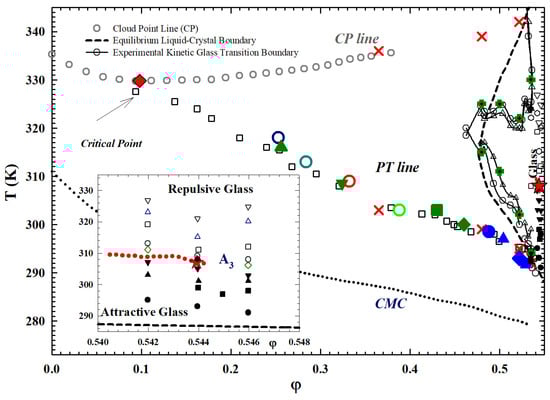 The experimental phase diagram (Temperature–Volume fraction) of the Pluronic L64 in DO characterized by a critical point (cloud point line, CP), the critical micellar concentration line (CMC), and a percolation line PT [,,,]. The inset reports an expanded region of the corresponding glass phase showing the attractive-glass–repulsive-glass transition line and the cusp-like singularity A.
