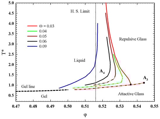 As shown in Figure 3, the corresponding phase diagram ( plane) shows two transition lines. The first one is a straight horizontal line corresponding to a continuous glass transition, (like in model A). On crossing this line, by increasing , increases continuously. The second line is a discontinuous transition, like in model B. This line (characterized by logarithm decay of the relaxation functions; see e.g., Figure 4) ends at the cusp-like A3 singularity [], where the plateaus of the two transitions coincide. This situation is very important because it represents a molecular system made up of a repulsive hard core plus an attractive interaction [].