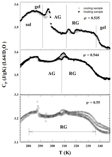 The specific heat data, Cp(J/gK) versus T, in the temperature interval 273–348 K, for our AHS system at the volume fraction = 0.535 (top panel), = 0.544 (central panel) and = 0.55 (bottom panel).