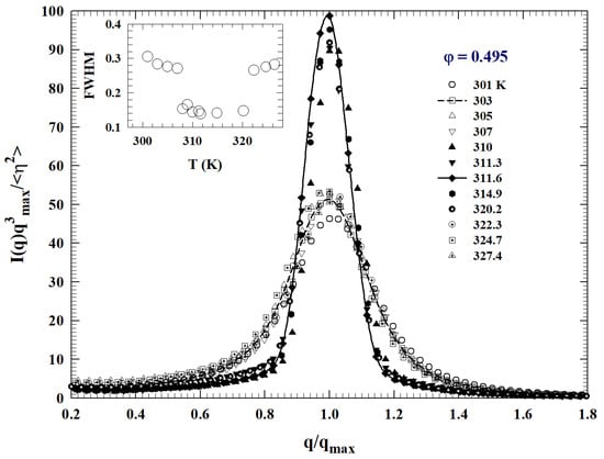 The scaling plots of the SANS intensities for measured in the PluronicL64-DO, at different temperatures in the range 310–327.4 K.