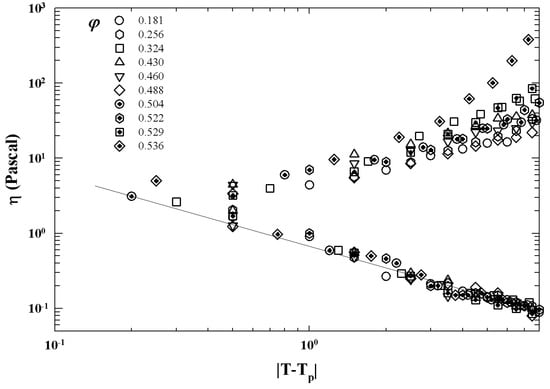 Figure 11 illustrates such a situation showing the corresponding viscosity data as a function of the reduced temperature . The slope of the continuous straight line give in according with the theoretical predictions for a 3-dimensional system [].