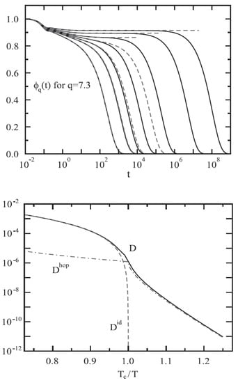 Below , diffusion coefficients () of tracer atoms differ greatly and essentially follow Arrhenius laws, whereas above ((), the values merge and follow, within experimental accuracy, the same super-Arrhenius T-dependence, typical of the collective caging motion. MCT extensions including additional “hopping” relaxation processes have been proposed soon [], although they have not been applied. Empirical scaling laws have been used [,], as well as schematic models [] that include an ad hoc hopping parameter. The used equations there have also been re-derived in order to reconcile MCT and the random first-order theory of the glass transition []. These studies were limited to discussing scaling deviations in the -relaxation due to hopping. Recently, Chong [] derived a semi-empirical microscopic MCT with hopping term, and was able to make parameter-free predictions that have been able to explain the decoupling of diffusion processes from the collective motion (the SEV). Moreover, features of the fragile-to-strong crossover found in a number of experiments have been analyzed within this theory [,].