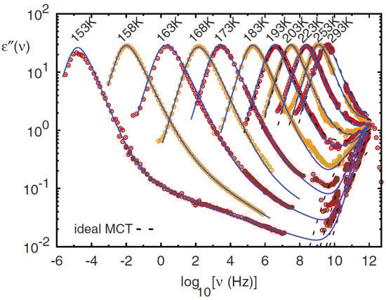 - Domschke, M.; Marsilius, M.; Blochowicz, T.; Voigtmann, T. Glassy relaxation and excess wing in mode-coupling theory: The dynamic susceptibility of propylene carbonate above and below. Phys. Rev. E 2011, 84, 031506. [Google Scholar] [CrossRef] [PubMed]