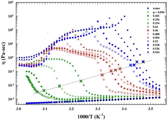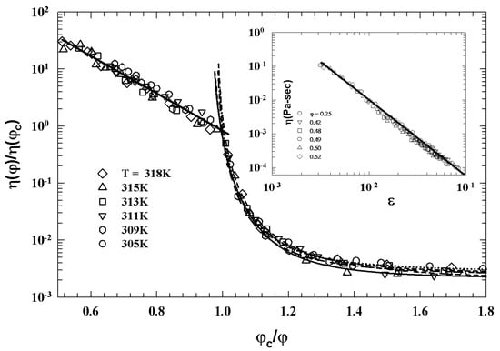 The shear viscosity measured at different volume franction reported in a log-log plot as a function of .