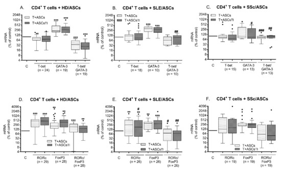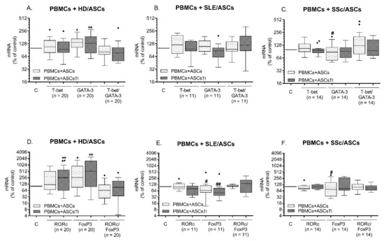 Changes in the expression of Th subset-specific transcription factors in mitogen-activated PBMCs co-cultured with ASCs. Explanations as in Figure 1, except that HD/ASCs (A,D), SLE/ASCs (B,E), and SSc/ASCs (C,F) lines were co-cultured with PHA-stimulated PBMCs that were isolated from peripheral blood of nine healthy volunteers. The ASCs + PBMCs co-cultures were done using a random combination of both cell types, and the number of experiments performed is shown (n). Results are expressed as the percentage of the mRNAs expression levels regarding those found in separately cultured control activated PBMCs (C) and are shown as the Tukey’s boxes; n—the number of experiments performed. * p = 0.05–0.01; ** p = 0.01–0.001 for intra-group comparison (PBMCs vs. PBMCs + ASCs or ASCsTI); # p = 0.05–0.01; ## p = 0.01–0.001 for inter-group comparison (HD vs. SLE vs. SSc).