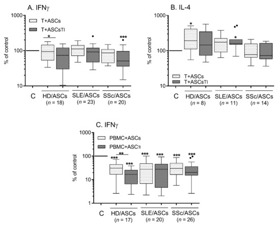 The effects of ASCs on the secretion of Th1 and Th2 subset-related cytokines by activated target cells. Cells were prepared and co-cultured as described in Figure 1 and Figure 2, except that HD/ASCs (n = 5), SLE/ASCs (n = 16), and SSc/ASCs (n = 14) lines were co-cultured with activated T cells (A,B) or activated PBMCs (C) that were isolated from peripheral blood of 15 and 17 healthy volunteers, respectively. The concentrations of IFNγ and IL-4 were measured in culture supernatants by specific ELISAs as described in the Materials and methods. Results are expressed as the percentage of the cytokine levels regarding those found in separately cultured activated control target cells (C) and are shown as the Tukey’s boxes; n—the number of experiments performed. * p = 0.05–0.01; ** p = 0.01–0.001; *** p = 0.001–0.0001 for intra-group comparison; the inter-group differences were statistically insignificant.