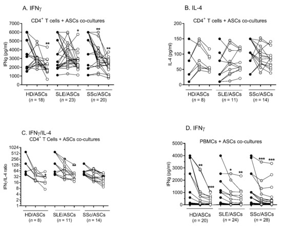 In the presence of HD/ASCs and SLE/ASCs, the secretion of IFNγ by Tact cells remained unchanged, while IL-4 release was increased (Figure 3A,B). Conversely, in the co-cultures containing TI-treated or both TI-treated and untreated SSc/ASCs, reduction of IFNγ and stable levels of IL-4, respectively, were observed (Figure 3A,B). Analysis of cytokine response in individual experiments showed that both HD/ASCs and ASCs from tested patients exert a modulatory effect on IFNγ and IL-4 secretion (Figure 4A,B), up-regulating these cytokines when the basal secretion is low and down-regulating them when the basal level is high. This modulatory impact of ASCs resulted in a significant reduction of the IFNγ/IL-4 ratio (Figure 4C). When PHA-activated PBMCs were used as the target cells, both HD/ASCs and ASCs from tested patients exerted a significant inhibitory effect on IFNγ secretion (Figure 3C and Figure 4D). In the co-cultures of ASCs with PBMCsPHA, the release of IL-4 was very low, usually below the detection limit (<5 pg/mL); therefore, we excluded these results from analysis (data not shown).