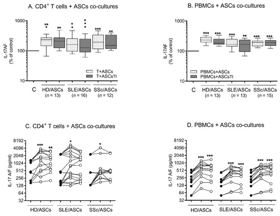 The effects of ASCs on the secretion of IL-17AF by activated target cells. Cell preparation and culture conditions as in Figure 3 and Figure 4, except that HD/ASCs (n = 5), SLE/ASCs (n = 18), and SSc/ASCs (n = 17) lines were co-cultured with activated T cells or activated PBMCs that were isolated from peripheral blood of 13 healthy volunteers. The concentrations of IL-17AF were measured in culture supernatants by specific ELISAs as described in the Materials and methods. (A,B)—the results are expressed as the percentage of the cytokine levels regarding those found in separately cultured activated control target cells (C) and are shown as the Tukey’s boxes. (C,D)—the same data shown as IL-17 AF concentrations in individual experiments in which lines between points identify cultures containing the same combination of ASCs and T cells (A,C) or PBMCs (B,D); n—the number of experiments performed. Black circles—separately cultured activated T cells (C) or PBMCs (D); grey circles—activated target cells + ASCs; unfilled circles—activated target cells + ASCsTI. * p = 0.05–0.01; ** p = 0.01–0.001; *** p = 0.001–0.0001 for intra-group comparison; the inter-group differences were statistically insignificant.