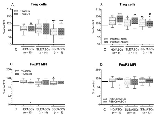 The generation of Tregs in the co-cultures of ASCs with activated target cells. CD4+ T cells and activated PBMCs. Cells were prepared and co-cultured as described in the Materials and methods. For the co-cultures of ASCs with activated T cells (A,C), CD4+ T lymphocytes isolated from peripheral blood of 13 healthy volunteers were randomly combined with 5 HD/ASCs, 10 SLE/ASCs, and 12 SSc/ASCs lines, while for the co-cultures of ASCs with activated PBMCs (B,D), PBMCs, HD/ASCs, SLE/ASCs, and SSc/ASCs were obtained from 6, 5, 8, and 9 donors, respectively. The number of Tregs (A,B) and the mean fluorescence density (MFI) of FoxP3 (C,D) were estimated as described in the Materials and methods. The results are expressed as the percentage of the Tregs regarding those found in separately cultured activated control target cells (C) and are shown as the Tukey’s boxes. * p = 0.05–0.01; ** p = 0.01–0.001; *** p = 0.001–0.0001 for intra-group comparison; # p = 0.05–0.01 for intra-group comparison; n—the number of experiments performed.