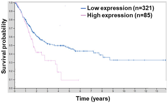 Figure 1. BCL9L expression is associated with worse survival probability. Survival analyses by the human protein atlas using TCGA data of 406 MIBC results in a significant correlation between high BCL9L expression and worse survival probability (expression cut-off 7.44 fragments per kilobase of transcript per million; log-rank p = 0.0029; http://www.proteinatlas.org/ENSG00000186174-BCL9L/pathology/urothelial+cancer) (accessed on 27 March 2022) [42,48].