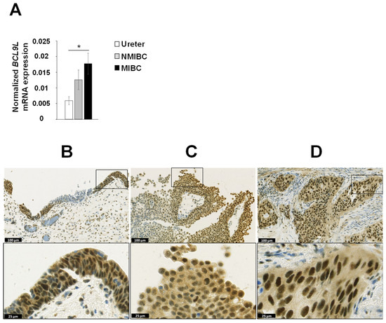 Figure 2. Expression of BCL9L in urothelium, dysplasia, and bladder cancer. (A) mRNA expression analysis of 8 matched NMIBC and corresponding MIBC patients and 3 normal urothelia (ureter) by qRT-PCR shows significantly increased expression in MIBC. The expression was normalised to housekeeping genes RPS13 and RPS23. The data are expressed as mean ± standard deviation and statistical analysis was performed by non-parametric Mann–Whitney U-test with * p-value < 0.05. (BD) Immunohistochemical staining of dysplastic urothelium, NMIBC, and MIBC. BCL9L is very heterogeneously expressed in different stages of urothelial dysplasia and bladder cancer. An increased expression was mainly found in dysplastic urothelium compared non or low dysplastic urothelium (B, patient 8), in peripheral cell layers of papillary NMIBC (C, patient 5), and in MIBC (D, patient 5). Scale bar upper images 100 µm, lower images 25 µm. Immunohistochemical staining of all patients are shown in Supplementary Figure S2.