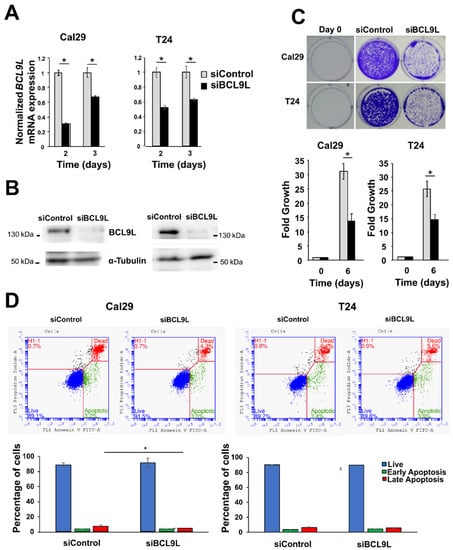 Figure 3. Cell proliferation and apoptosis analysis of bladder cancer after BCL9L knockdown. (A) mRNA expression of BCL9L after knockdown by qRT-PCR in Cal29 (n = 4) and T24 (n = 4) cells. siControl was set as 1 arbitrarily. (B) The protein level of BCL9L of transfected cells siBCL9L and siControl after 3 days transfection. (C) Cell proliferation is significantly reduced in BCL9L knockdown cells, analysed by crystal violet staining assay (n = 4) (D) BCL9L knockdown did not affect apoptosis of BC cells. The apoptosis assay was performed by dual staining with annexin V-FITC and propidium iodide (PI) kit and analysed by flow cytometry. * p-value < 0.05 Mann–Whitney U-test, n = independent experiments.