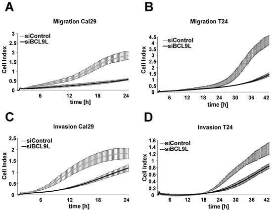 We investigated the effect of BCL9L on cell migration and invasion in bladder cancer cells in real-time using the xCELLigence RTCA system after transfection with siBCL9L. BCL9L knockdown significantly inhibits the cell migration of Cal29 (p-value < 0.05 for the time frame 12–20 h) and T24 (p-value < 0.05 for the time frame 13–42 h) compared to siControl (Figure 4A,B, Supplementary Figure S4). Knockdown of BCL9L significantly represses the cell invasion of Cal29 (p-value < 0.05 for the time frame between 5–21 h) and T24 (p-value < 0.05 for the time frame 34–42 h) cells compared to siControl (Figure 4C,D, Supplementary Figure S4). Our data show that BCL9L knockdown inhibits migration and invasion of BC cells. It is suggested that BCL9L could promote cell proliferation, migration and invasion in BC cells.