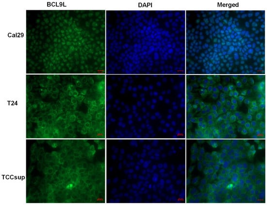 It has been reported that BCL9L is localised in the nucleus of cells and interacts with β-catenin or PYGO proteins, enhancing Wnt/β-catenin signalling [28,50]. However, in the mouse system, bcl9l is localised in the cytoplasm, suggesting a cytoplasmic role of bcl9l in mouse cells [29]. The localisation of BCL9L in bladder cancer cells is not known. Therefore, the localisation of BCL9L was examined in Cal29 T24 and TCCsup cells by immunofluorescence. BCL9L is mainly localised in the nucleus of Cal29 cells, however, T24 and TCCsup cells show more cytoplasmic localisation (Figure 5), suggesting a distinct role of BCL9L in these cell lines.