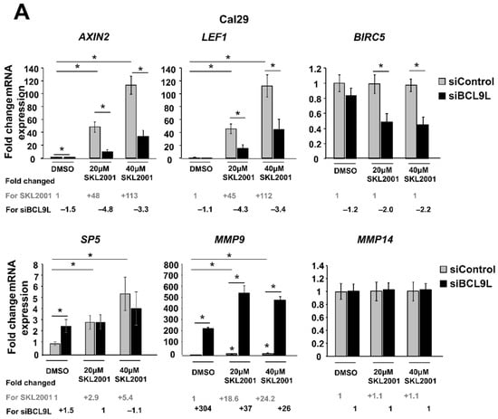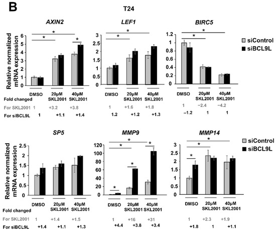 In T24 cells, the mRNA level of AXIN2, LEF1, MMP9, and MMP14 was significantly increased after SKL2001 treatment. No differences are observed in the case of the SP5 target gene. Unexpectedly, BIRC5 mRNA expression was significantly reduced with increased SKL2001 concentration. However, a positive effect of SKL2001 on target expression was not reversed after knockdown of BCL9L. Similar to Cal29 cells, MMP9 mRNA expression was strongly and significantly increased in a concentration manner of SKL2001, and BCL9L knockdown resulted in further induction of MMP9 in T24 cells (p < 0.05, Figure 6B). The data suggests that the activator SKL2001 could increase a subset of Wnt/β-catenin target genes at a higher level in Cal29 compared to T24 cells. Moreover, the SKL2001-induced expression of a subset target is reduced after the knockdown of BCL9L in CAL29.