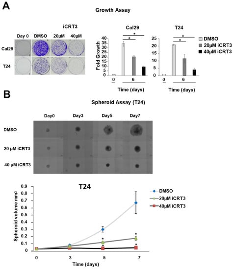 Figure 7. Proliferation and spheroid growth analysis after Wnt/β-catenin signalling inhibition in bladder cancer cells. (A) Crystal violet staining of Cal29 (n = 3) and T24 (n = 3) cells after 8 days treatment with 40 μM and 20 μM of the inhibitor iCRT3. Day 0 was set as 1 arbitrarily. (B) Spheroid analysis of T24 (n = 6) cells after 3-, 5-, 7-days treatment with 40 μM and 20 μM iCRT3. (* p-value < 0.05, Mann–Whitney U-test, n: independent biological replicates).