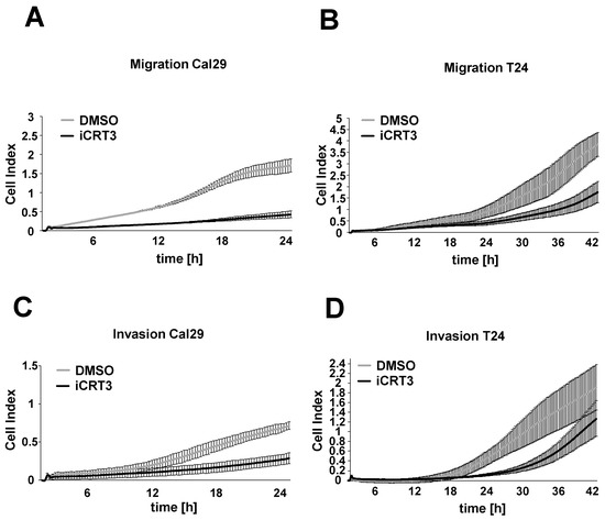 Figure 8. Cell migration and invasion analysis after Wnt/β-catenin signalling inhibition in bladder cancer cells. Treated Cal29 (A) and T24 (B) cells with 40 μM iCRT3 and 0.1% DMSO were seeded on CIM plates and migration was analysed in real-time by the xCELLigence system. Treated Cal29 (C) and T24 (D) cells were seeded in the pre-coated CIM plate with matrigel and the invasion was analysed. The figure represents one of the biological replicates. All three independent biological replicates are shown in Supplementary Figure S7. The data are expressed as mean ± standard deviation of three technical replicates. The cell index values correspond to the cell number that migrates or invades.