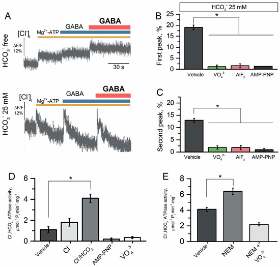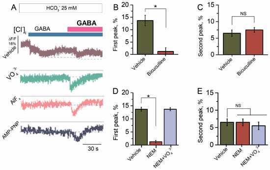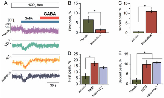 The preliminary studies have shown that HCO3− increased the GABAAR-mediated Cl− influx in the neurons [40]. In our study, the SNs in the presence of HCO3− (25 mM) showed increased Cl− influx in response to the first application of GABA (100 μM) with a maximum peak of fluorescence changes of 13.7 ± 2.1% (n = 5) (Figure 2A). Reapplication of GABA (100 μM) revealed a decrease in the GABAAR-mediated Cl− influx by two times with a maximum peak of fluorescence changes of 6.5 ± 1.0% (n = 5). Previously, it was shown that the effect of ATP and γPAs on GABAAR-mediated Cl− transport in the neurons depends on the presence of HCO3− in the experimental medium [22,23,24]. To probe whether the HCO3− can regulate the GABAAR function, we studied the effect of γPAs on the GABAAR-mediated Cl− influx in the presence of a physiological concentration of HCO3− (25 mM) (Figure 2A). Here, γPAs eliminated the GABA-mediated Cl− influx into neurons at the first application and activated it approximately two times on reapplication of the agonist (Figure 2A). Bicuculline completely suppressed the first peak of the GABA-mediated fluorescence changes, confirming the receptor-dependent method of mediator action (Figure 2B). In contrast, at reapplication of the mediator, bicuculline had no significant influence (7.5 ± 0.8%, n = 6) on the Cl− influx in the SNs (Figure 2C). Similar to bicuculline’s effect, NEM (300 μM) inhibited (1.3 ± 1.2%, n = 6) on the first application and had no effect (6.5 ± 1.0%, n = 6) on repeated application of GABA (Figure 2D). Meanwhile, in the presence of VO43− (20 μM) in the experimental medium, the NEM effect was eliminated in the first case (Figure 2D) and unchanged at reapplication of GABA (Figure 2E).