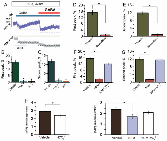 When exposed to NEM (300 μM), the GABA-mediated pHi changes were significantly eliminated for both the first and repeat application of GABA (Figure 3F,G). However, the NEM effect did not appear in the presence of VO43− (20 μM), thus indicating the energy-dependent method of action (Figure 3F,G). These data suggest that NEM and HCO3− have similar binding sites that are close to the ATP-hydrolyzing center. In order to ascertain this hypothesis, we examined the influence of HCO3− and NEM on [ATP]i. In the control samples, the concentration of [ATP]i was 3.0 nmol/mg protein and the addition of HCO3− (25 mM) induced a decrease in [ATP]i by 29.2 ± 1.0% (n = 6) (Figure 3H). Moreover, as shown in Figure 3I, the addition of NEM in the experience medium also resulted in a decline in [ATP]i by 37.6 ± 1.2% (n = 5). However, the influence of NEM on [ATP]i did not appear in the presence of VO43− (20 μM).