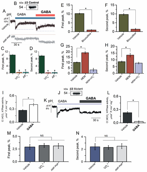 β3 subunit is responsible for GABAAR resensitization in HEK 293FT cells. (A) Representative images of BCECF fluorescence changes in HEK 293FT cells expressing β3 GABAAR isoform and (B) Western blot analysis binding of VLPs with antibody against GABAAR β3 subunit after expression of GABAAR β3 subunit in HEK 293FT cells. (C) Bar graph of percentage in BCECF peak fluorescence changes in HEK 293FT cells expressing β3 GABAAR isoform recorded in response to first application of GABA (100 μM), without or in the presence of VO43− (20 μM) or AlFx (20 μM) (one-way ANOVA, Tukey’s test: F(19) = 5.0, p = 0.05 or F(19) = 2.18, p = 0.05, n = 5). (D) Bar graph of percentage in BCECF peak fluorescence changes in HEK 293FT cells expressing β3 GABAAR isoform recorded in response in response to second application of GABA (100 μM), without or in the presence of VO43− (20 μM) or AlFx (20 μM) (one-way ANOVA, Tukey’s test: F(19) = 5.0, p = 0.05 or F(19) = 2.18, p = 0.05, n = 5). (E) Bar graph of percentage in BCECF peak fluorescence changes in HEK 293FT cells expressing β3 GABAAR isoform recorded in response to first application of GABA (100 μM), without or in the presence of bicuculline (50 μM) (one-way ANOVA, Tukey’s test: F(19) = 192.5, p = 0.000001, n = 5). (F) Bar graph of percentage in BCECF peak fluorescence changes in HEK 293FT cells expressing β3 GABAAR isoform recorded in response in response to second application of GABA (100 μM), without or in the presence of bicuculline (50 μM) (one-way ANOVA, Tukey’s test: F(19) = 268.0, p = 0.0000005, n = 5). (G) Bar graph of percentage in BCECF peak fluorescence changes in HEK 293FT cells expressing β3 GABAAR isoform recorded in response to first application of GABA (100 μM) without or containing NEM (300 μM), in the absence and presence of VO43− (20 μM) in an experimental medium (one-way ANOVA, Tukey’s test: F(19) = 36.5, p = 0.001 or F(19) = 29.0, p = 0.005, n = 5), respectively. (H) Bar graph of percentage in BCECF peak fluorescence changes in HEK 293FT cells expressing β3 GABAAR isoform recorded in response to first and repeat application of GABA (100 μM) without or containing NEM (300 μM), in the absence and presence of VO43− (20 μM) in an experimental medium (one-way ANOVA, Tukey’s test: F(19) = 5.0, p = 0.05 or F(19) = 2.18, p = 0.05, n = 5), respectively. (I) Bar graph of evaluation of Cl−, HCO3− ATPase activity before and after the application of GABA (100 μM) in HEK 293FT cells expressing β3 GABAAR isoform (one-way ANOVA, Tukey’s test: F(6,9) = 7.84, p = 0.005, n = 7). (J) Western blot analysis binding of VLPs with antibody against GABAAR β3 subunit after expression of mutant (C313A) GABAAR β3 subunit in HEK 293FT cells. (K) Representative images of BCECF fluorescence changes in HEK 293FT cells expressing mutant β3 GABAAR isoform recorded in response to first application of GABA (100 μM) and reapplication of GABA (100 μM) in the presence of HCO3− (25 mM) in an experimental medium. (L) Bar graph of evaluation of Cl−, HCO3− ATPase activity before and after the application of GABA (100 μM) in HEK 293FT cells expressing mutant β3 GABAAR isoform (one-way ANOVA, Tukey’s test: F(0,02) = 7.84, p = 0.005, n = 7). (M) Bar graph of percentage in MQAE peak fluorescence changes in response to first application of GABA (100 μM) in the absence and presence of VO43− (20 μM) or AMP-PNP (2 mM) in an experimental medium (one-way ANOVA, Tukey’s test, n = 5), respectively. (N) Bar graph of percentage in MQAE peak fluorescence changes in response to reapplication of GABA (100 μM) in the absence and presence of VO43− (20 μM) or AMP-PNP (2 mM) in an experimental medium (one-way ANOVA, Tukey’s test, n = 5), respectively. All data in the bar graphs in this figure and those proceeding it are presented as mean values +/− SEM; * p < 0.05.