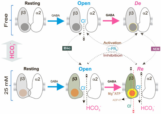 Bicarbonate preferentially stabilized GABAAR via ATPase performance. Model showing four basic conformation states that depict the GABAAR function: a resting state; an open state; a desensitization state; and a resensitization state. In an HCO3−-free experimental medium, fist application of GABA shifted the equilibrium from resting state to high-affinity open state, and repeat application of agonist induced GABAAR desensitization. In contrast, in the presence of HCO3− (25 mM) in an experimental medium, first application of GABA induced the changes in the conformation of channel and shifted the equilibrium from resting state to high-affinity open state, whereas the reapplication of agonist induced GABAAR resensitization by β3-coupled ATPase operation.
