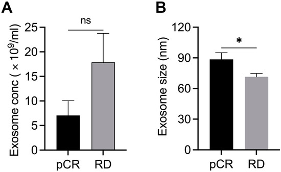 Characterization of exosomes in plasma samples from patients with BC showing pCR (n = 8) or RD (n = 8) after NAC. Bar graphs showing the concentration (A) and mean size (B) of exosomes in patients with pCR or RD after NAC. Bars indicate mean ± SEM. Unpaired two-tailed Student’s t-test with Welch’s correction was used to determine statistical significance (ns, non-significant; * p < 0.05).