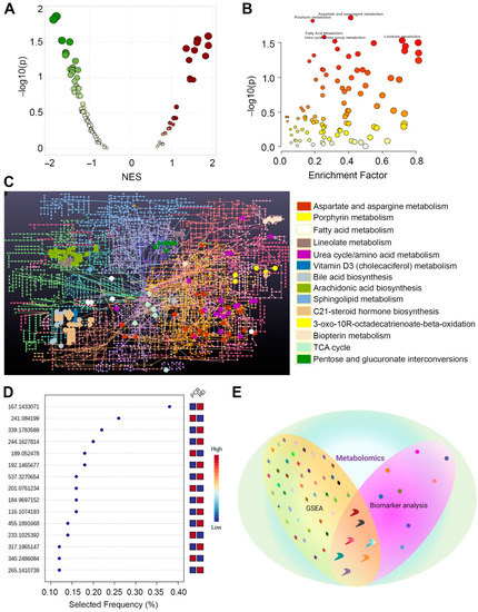 The knowledge base for GSEA consists of five genome-scale metabolic models obtained from the original Python implementation which have either been manually curated or downloaded from BioCyc, an expanded library of 21 organisms derived from KEGG metabolic pathways, and 10 distinct metabolite set libraries. The selected library was hsamfn. A total of 13,366 m/z features were found in the uploaded data. The instrument’s mass accuracy was 5 ppm, with negative ion mode. The range of m/z peaks was trimmed to 50–2000; 0 features were trimmed. A total of 13,366 input m/z features were retained for further analysis. The p-value cut-off was 0.25%. Default top 10% peaks were selected. The output of the GSEA consisted of a table of results containing ranked pathways that were enriched in the user-uploaded data. The table included the total number of hits (all and expected), raw p-values, and adjusted p-values.