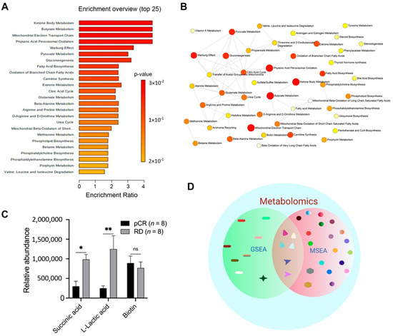 Succinic acid and L-lactic acid are significantly upregulated in plasma exosomes of patients with RD after NAC. Differentially regulated metabolic pathways and metabolites were identified using MSEA. (A) Network showing metabolic pathways differentially regulated in patients with RD or pCR after NAC. (B) Summary plot showing the top 25 differentially enriched metabolic pathways. Each node represents a metabolite set with its color based on its p-value and its size based on number hits to submitted query. Two metabolite sets are connected by an edge if the number of their shared metabolites is over 25% of the total number of their combined metabolite sets. (C) Bar graphs showing the levels of various metabolites in patients with RD and those with pCR. (D) Venn diagram showing common metabolites identified using GSEA and MSEA. Bars indicate mean ± SEM. Two-way ANOVA with Sidak’s multiple comparison test was used to determine statistical significance. ns, non-significant; * p < 0.05; ** p < 0.005; The scheme in (D) was created using Bi-oRender, Toronto, ON, Canada.