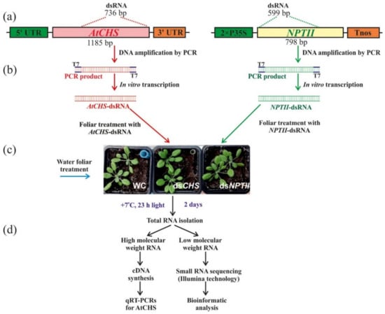 Schematic representation of the experiment conducted in the study to verify the effects of external dsRNA treatments in Arabidopsis thaliana on small RNAs profiles and AtCHS gene expression. (a) Representation of AtCHS- and NPTII-coding regions with positions of the AtCHS- and NPTII-specific dsRNA; (b) PCRs with the T7 promoter appended to both PCR primers for AtCHS and NPTII partial amplification, followed by in vitro dsRNA production; (c) plant foliar treatments with AtCHS- and NPTII-specific dsRNA; (d) low- and high-molecular-weight RNA isolation and processing. 2xP35S—the double 35S promoter of the cauliflower mosaic virus (CaMV); AtCHS—the chalcone synthase gene from A. thaliana; NPTII—the neomycin phosphotransferase II (NPTII) gene; Tnos—nopaline synthase terminator. T7–T7 promoter.