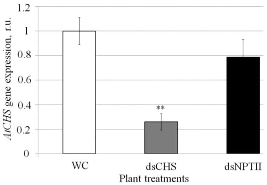 The effect of external AtCHS- and NPTII-encoding dsRNAs on AtCHS mRNA level in Arabidopsis thaliana analyzed by quantitative real-time PCR. WC—A. thaliana treated with sterile water; dsCHS—A. thaliana treated with AtCHS-dsRNA; dsNPTII—A. thaliana treated with NPTII-dsRNA; dpt—days post-treatment. A. thaliana plants were grown under anthocyanin-inducing (+7 °C, 23 h light) conditions for two days after treatment with sterile water or synthetic dsRNA. qRT-PCR data are presented as the mean ± SE. **—significantly different from WC at p ≤ 0.01 according to Student’s t-test.