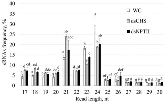 Length size distribution of total small RNAs in Arabidopsis thaliana after treatment with water or dsRNA. WC—A. thaliana plants treated with sterile water; dsCHS—A. thaliana treated with AtCHS-dsRNA; dsNPTII—A. thaliana treated with NPTII-dsRNA. The data are presented as the mean ± SE. Means followed by the same letter were not different using Student’s t-test. p < 0.05 was considered statistically significant.