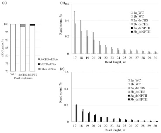 The effect of AtCHS-dsRNA and NPTII-dsRNA on the proportion and length size distribution of AtCHS-encoding 17–30-nt sRNAs among all detected small RNAs. (a) The proportion of AtCHS- and NPTII-encoding 17–30-nt sRNAs among all detected small RNAs. WC—A. thaliana plants treated with sterile water; dsCHS—A. thaliana treated with AtCHS-dsRNA; dsNPTII—A. thaliana treated with NPTII-dsRNA; (b) length size distribution of AtCHS-encoding 17–30-nt sRNAs; (c) length size distribution of NPTII-encoding 17–30-nt sRNAs. 1a_WC, 1b_WC—two A. thaliana plants treated with sterile water; 2a_dsCHS, 2b_dsCHS—two A. thaliana plants treated with AtCHS-dsRNA; 3a_dsNPTII, 3b_dsNPTII—two A. thaliana plants treated with NPTII-dsRNA.