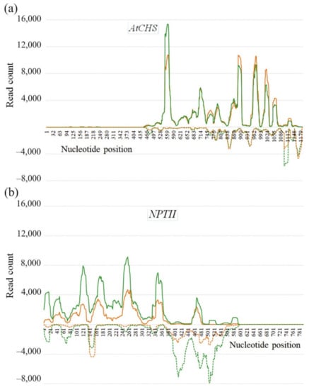 We also analyzed the sRNA distribution patterns across both the CHS and NPTII genes (Figure 5a,b). The majority of sRNAs were not uniformly mapped along both the CHS and NPTII genes and covered the gene sequences unevenly with high frequencies of reads at particular positions, including 6–8 peak read count positions for the sense strand and 5–6 peak read count positions for the antisense strand. The AtCHS gene sense sequence was covered by 8 peaks of read counts (528–559 nt, 714–745 nt, 745–776 nt, 776–807 nt, 869–900 nt, 962–993 nt, 993–1024 nt, 1055–1086 nt), while the antisense sequence was covered by 6 peaks (776–807 nt, 838–869 nt, 931–962 nt, 1086–1117 nt, 1148–1179 nt) (Figure 5a). Similarly, the NPTII sense sequence was covered by 7 peaks (1–31 nt, 31–61 nt, 91–121 nt, 151–181 nt, 241–271 nt, 331–361 nt, 451–481 nt). In the mentioned intervals, the number of reads prevailed over read counts at other positions. For example, there are almost no sRNAs mapping to the sense NPTII strand at 391–451 nt position (Figure 5a). The antisense sequence of the NPTII gene was covered by a fewer number of peaks with 5 peaks of read counts (1–31 nt, 61–91 nt, 121–151 nt, 391–421 nt, 481–511 nt). Notably, the peak positions on the sense strand did not coincide with the peak positions on the antisense strand (Figure 5). Most reads mapped to the sense strands of both the AtCHS and NPTII genes. For the AtCHS gene, there were 1.4–1.5 times more sequences identical to the sense than for the antisense gene strand (Figure 5a). Similarly, for the NPTII gene, reads mapped to the sense strand 2.5–2.7 times higher than to the antisense NPTII strand (Figure 5b).