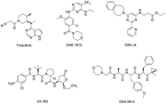 A number of small molecules have been developed to treat immune disorders by regulating cytokine function. They act on proteins involved in the cytokine production pathway to regulate cytokine production and signaling. So far, tofacitinib, GNE-7915, GSK-J4, VX-765, and ONX 0914 have been developed as representative inflammatory cytokine inhibitors (Figure 1) [13,14,15,16,17,18,19,20,21,22,23,24]. Unlike biopharmaceuticals such as protein-based therapies, these small molecule modulators can act on intracellular proteins and modulate abnormal cytokine signaling or downstream sequences.