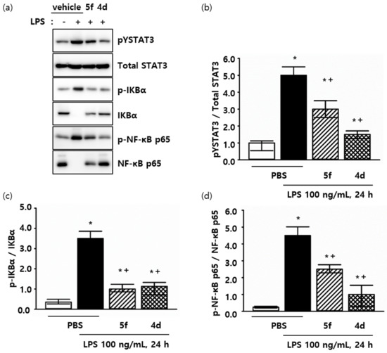 Compounds 5f and 4d attenuate inflammation in vitro. Effects of compounds (10 µM) on the protein levels of STAT3, IκB, and NF-κB in AML-12 cells. (a) Expression levels of inflammation related-proteins in vitro. (b–d) Protein expression levels were normal-ized against the indicated protein. * p < 0.05 compared with the group treated with the PBS (vehicle). + p < 0.05 compared with the group treated with the LPS. Data are pre-sented as the mean ± SD.