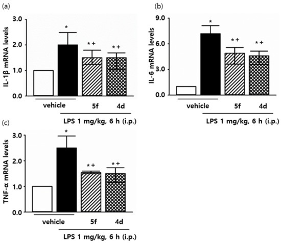 mRNA expression levels of inflammatory cytokines after treatment of compounds 5f and 4d. (a) mRNA expression level of IL-1β, (b) mRNA expression level of IL-6, (c) mRNA expression level of TNF-α. * p < 0.05 compared with the group treated with the PBS (vehicle). + p < 0.05 compared with the group treated with the LPS. Data are presented as the mean ± SD.