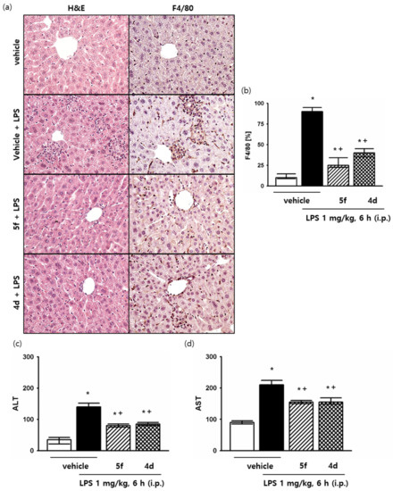 Protective effects of compounds 5f and 4d in vivo models for LPS induced-liver in-flammation disease. (a,b) Histopathological examination was performed using H&E staining and immunohistochemical staining using F4/80 antibody, the F4/80 positive areas were quantified, magnification are ×400. (c,d) Effects of compounds on serum ALT and AST levels during liver inflammation. * p < 0.05 compared with the group treated with the PBS (vehicle). + p < 0.05 compared with the group treated with the LPS. Data are presented as the mean ± SD.