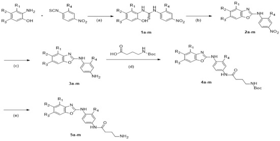 Novel compounds with 4-amino-N-(4-(benzo[d]oxazol-2-ylamino)phenyl)butanamide derivatives were synthesized as shown in Scheme 1. As the starting materials, variously substituted 2-aminophenol were commercially obtained. 1-Isothiocyanato-4-nitrobenzene or 1-isothiocyanato-2-methoxy-4-nitrobenzene were reacted with them to give thiourea compounds (compounds 1a–m). The thiourea compounds were cyclized with KO2 to obtain benzoxazole compounds by oxidation process (compounds 2a–m). The nitro groups were reduced to amino groups with Pd/C under H2 atmosphere (compounds 3a–m). The resulting amino groups were reacted with N-tert-butyloxycarbonyl (boc)-γ-aminobutyric acid (compounds 4a–m) and N-boc groups were removed with 4 M HCl in dioxane to obtain 4-amino-N-(4-(benzo[d]oxazol-2-ylamino)phenyl)butanamide derivatives (compounds 5a–m).