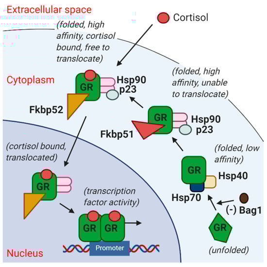Simplified diagram of the glucocorticoid receptor (GR) stress signalling pathway. GR (unfolded) is unable to bind cortisol when bound to Bag1, and release of Bag1 allows GR to bind cortisol with low affinity, whereas Fkbp51 (encoded by Fkbp5) and p23 (encoded by Ptges3) are involved in increasing GR affinity to cortisol by stabilizing the GR heterocomplex into a high affinity state. Furthermore, Fkbp52 (encoded by Fkbp4) dislocates Fkbp51 and facilitates nuclear translocation of the cortisol-bound GR heterocomplex into the nucleus to activate or repress target genes. Thus, higher Fkbp51 would promote GR retention in the cytoplasm, rendering target genes less responsive to stress [,,,]. GR = glucocorticoid receptor; Hsp = heat shock protein.