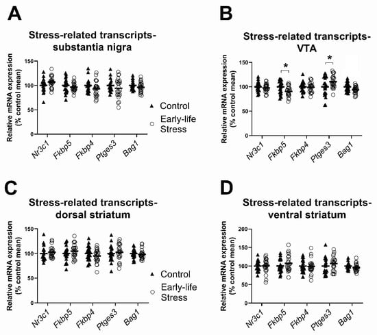 Effects of early life stress on stress-related transcript levels. (A,C,D) There were no main effects of early life stress in the substantia nigra, dorsal striatum or ventral striatum; (B) maternally separated rats of both sexes had lower Fkbp5 and higher Ptges3 mRNA in the VTA than control rats. Data are expressed as a percentage of the control group mean. Each data point represents a single animal. Filled triangles and hollow circles represent control and early life stress animals, respectively. Horizontal lines depict group means. * p < 0.05.