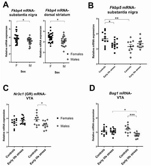 We hypothesised that early life stress alters expression of stress-signalling factors (Nr3c1, Fkbp4, Fkbp5, Ptges3, Bag1) and splice variants of Bdnf in such a way as to decrease the sensitivity of dopaminergic regions to glucocorticoid (stress) hormones and diminish trophic support for dopaminergic neurons, at the transcriptional level. Since stress and sex hormones interact to influence dopaminergic brain regions (reviewed in []) and females are less vulnerable to dopamine-related psychopathology than males [,], we also hypothesised that transcriptional changes due to early life stress would occur in a sex-dependent way with females poised to be more resilient to stress than males.