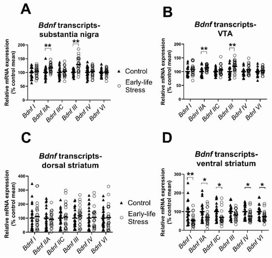 Effects of early life stress on BDNF transcript levels. (A,B) Maternally separated rats had higher levels of Bdnf IIA and III mRNAs in the substantia nigra and VTA than control rats; (C) there were no main effects of early life stress on Bdnf transcripts in the dorsal striatum; (D) maternally separated rats had lower levels of Bdnf I, IIA, IIC, IV and VI mRNAs in the ventral striatum than control rats. Data are expressed as a percentage of the control group mean. Each data point represents a single animal. Filled triangles and hollow circles represent control and early life stress animals, respectively. Horizontal lines depict group means. * p < 0.05, ** p < 0.005.